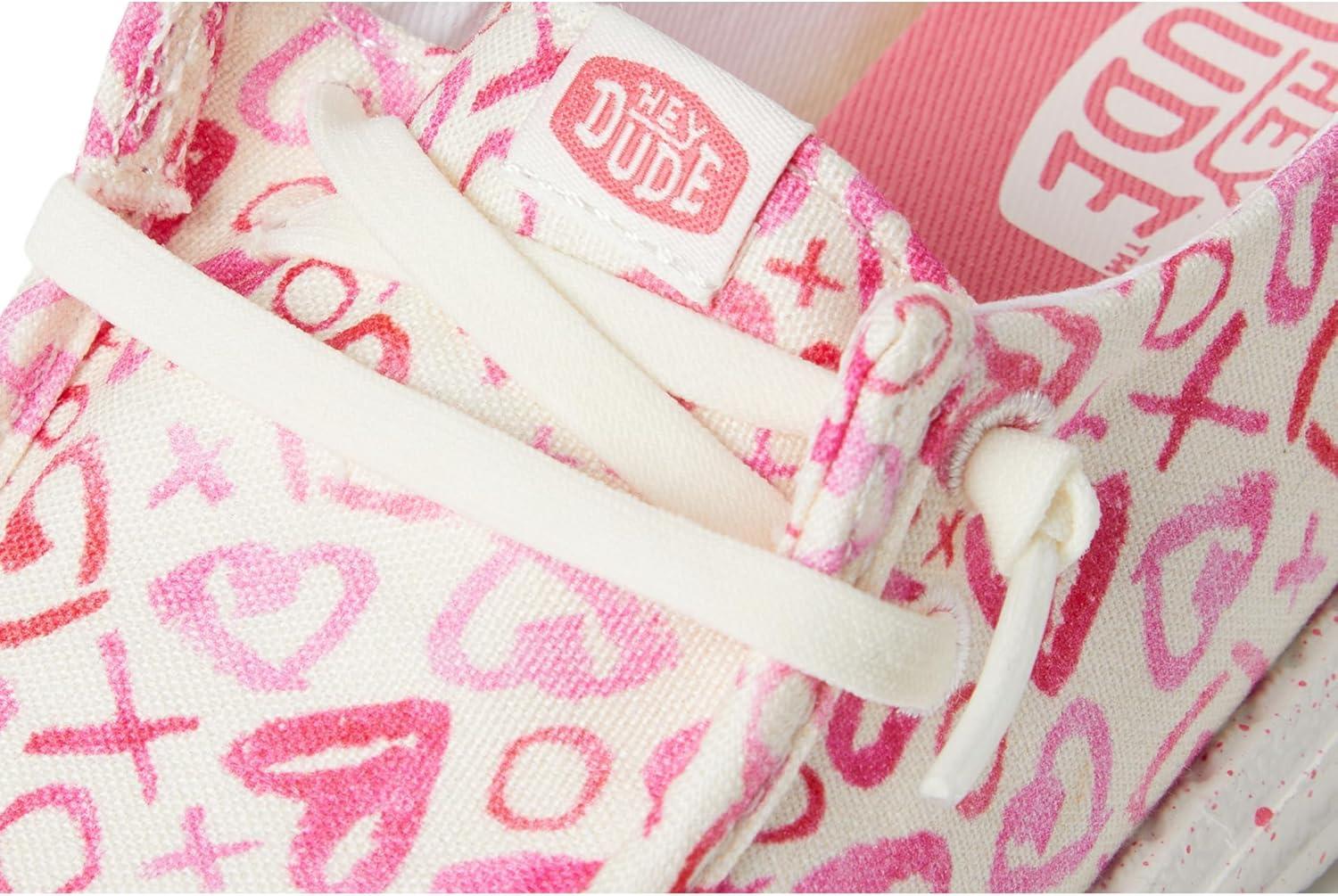 Featuring an allover heart print, the Hey Dude Kids Wendy Watercolor Hearts are ready to roam. The canvas upper features elastic laces and a Flex & Fold design that supports healthy feet. These lace-up shoes are made of a cotton lining and removable memory foam cushioned insole that provides maximum comfort and reduces sweating and odors. These printed sneakers will be an instant favorite in your kid's modern-casual shoe collection. Round toe design. EVA outsole.