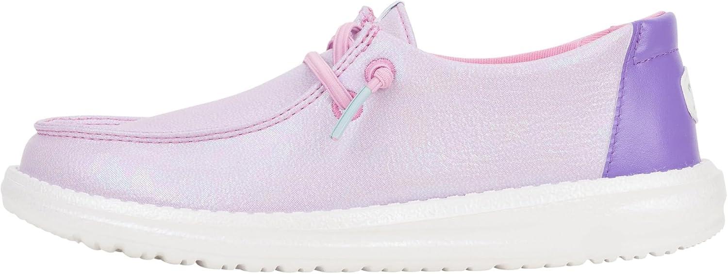 The Hey Dude Kids Wendy Iridescent Sparkle shoes hug your kid's feet like a sweater while staying cushy and airy and always just right. These sneakers are designed with a removable memory foam cushioned insole and cotton lining that provides maximum comfort. The canvas upper of these shoes features a Flex & Fold design that helps support healthy feet while the elastic laces ensure a secure fit. Lightweight and machine washable, these lace-up shoes are crafted with a lightweight and flexible rubber outsole that lets your kid go the extra mile. Pull-on style. Round toe silhouette.