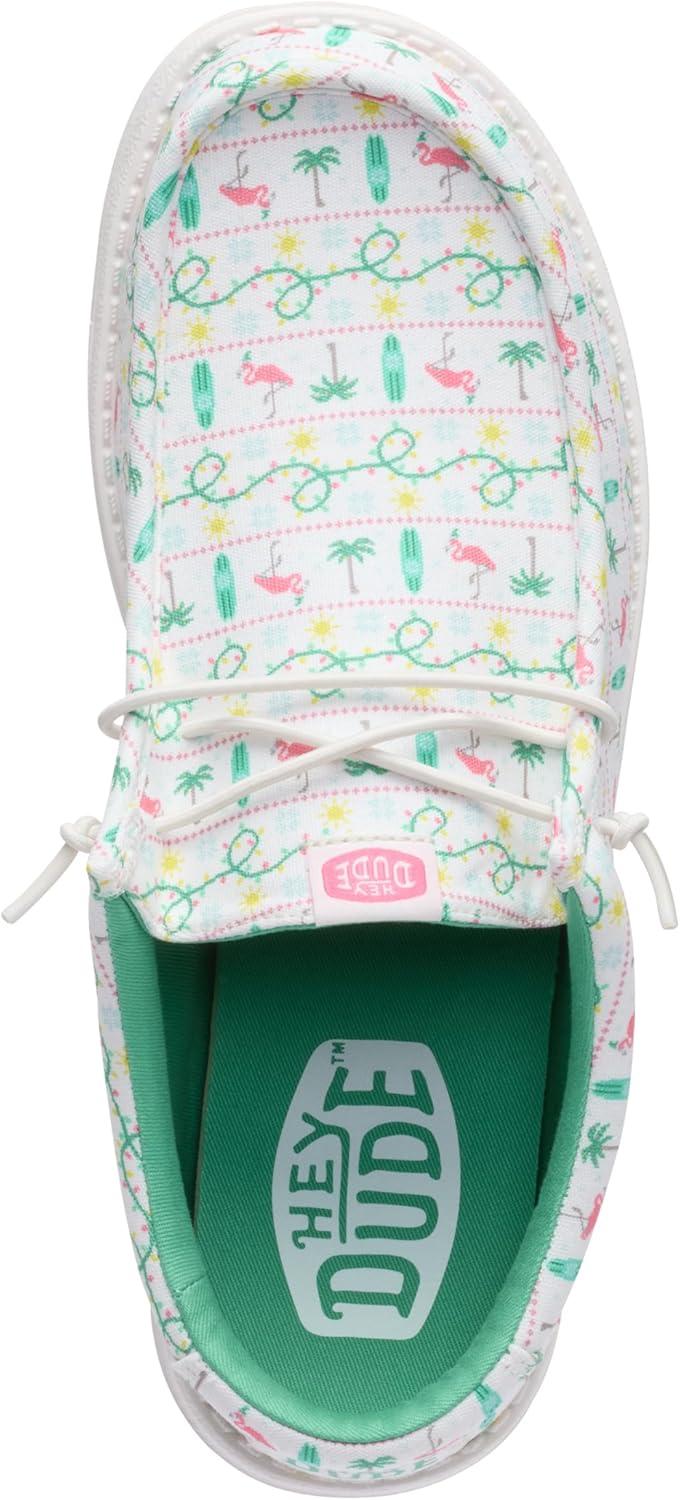 Easy, breezy, canvas material makes these Hey Dude Fishmas Sweater shoes ready to roam. Their easy-on elastic laces ensure a secure fit, while the Flex & Fold design supports healthy feet with their unique shape, giving complete freedom of movement. These printed sneakers are made of an EVA insole and cotton lining. Add a festive touch to your outfits with these slip-on sneakers. Heel pull tab. Round toe silhouette. EVA outsole.
