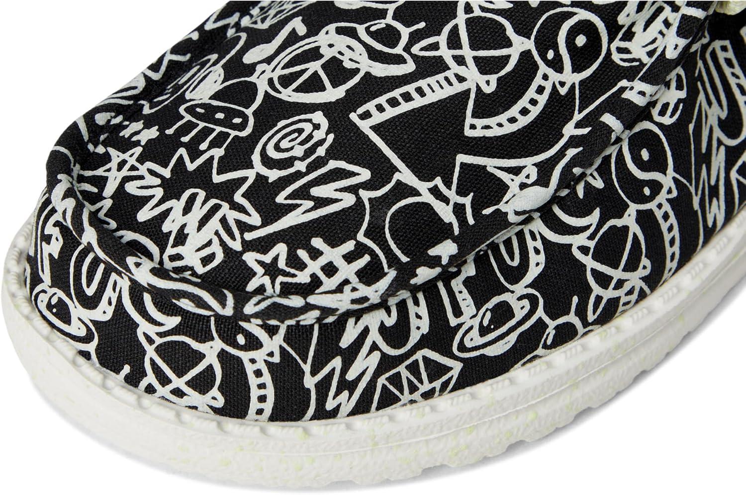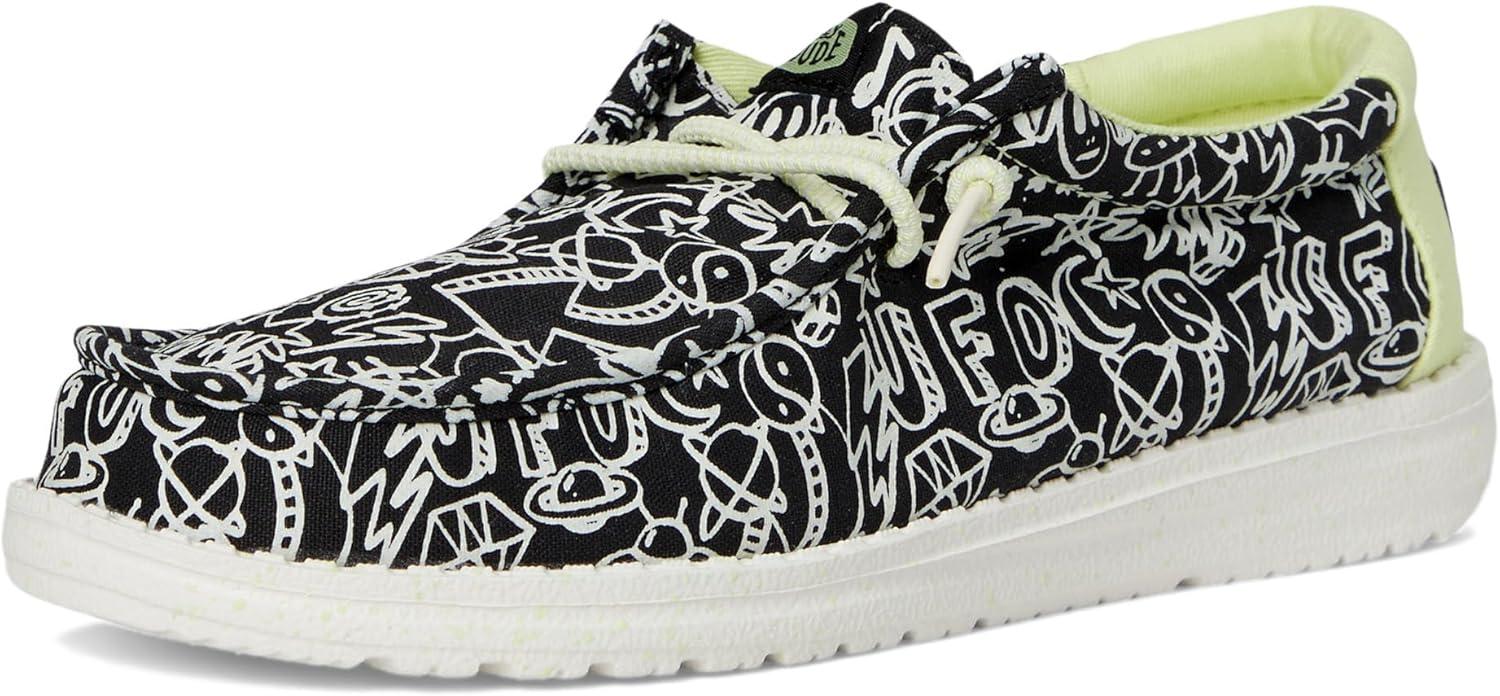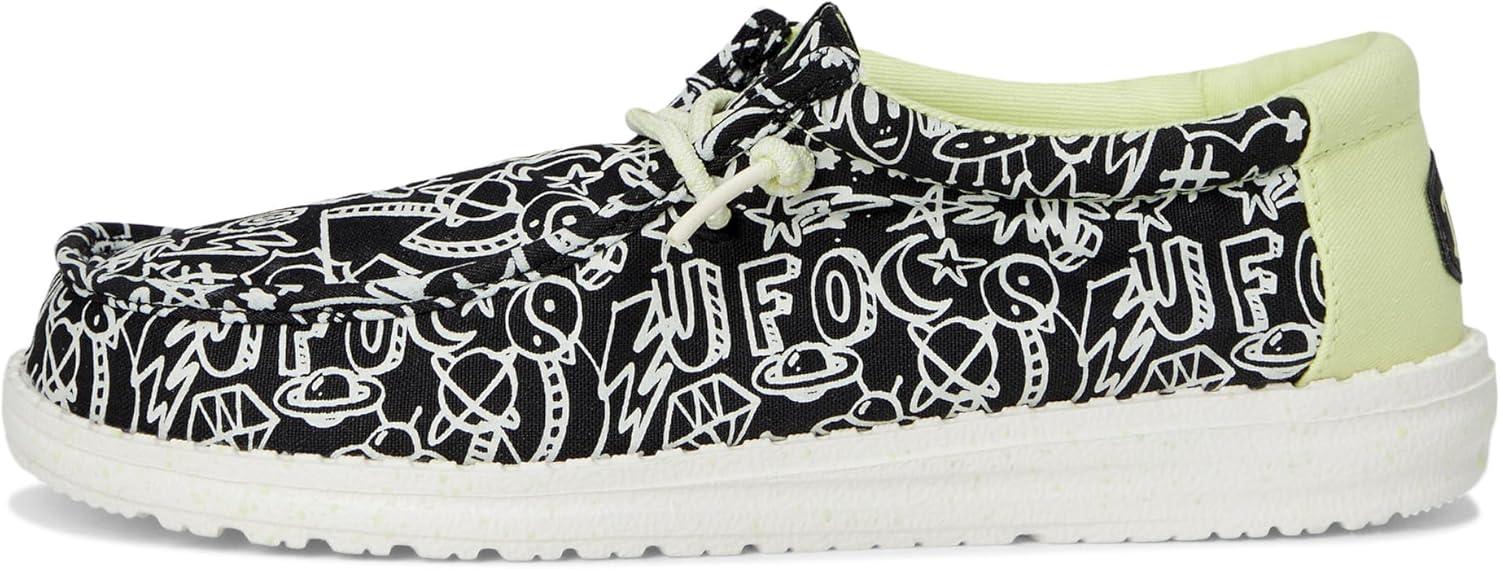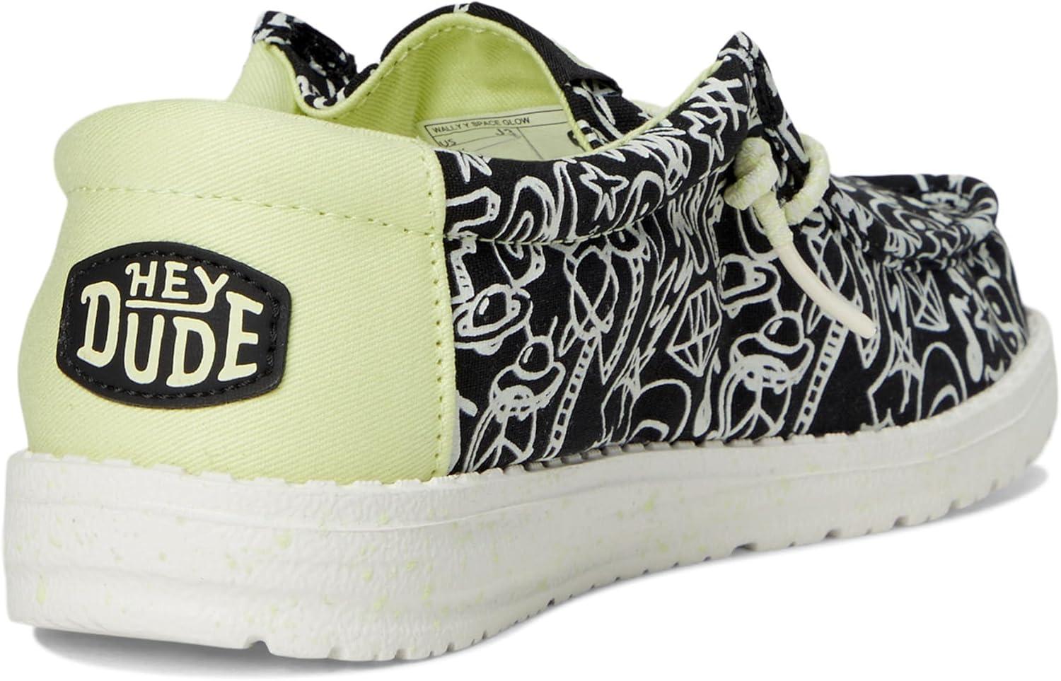 The Hey Dude Kids Wally Space Glow shoe is built for adventure with a breathable textile-canvas upper that keeps things light and breezy. Easy-on elastic laces make slipping in and heading out a breeze, while the cushy ethylene vinyl acetate outsole and removable insole deliver all-day comfort for nonstop play. Cotton lining. Low-top profile. Rounded Toe Design and Flex & Fold: This supports healthy feet with its unique shape giving complete freedom of movement.