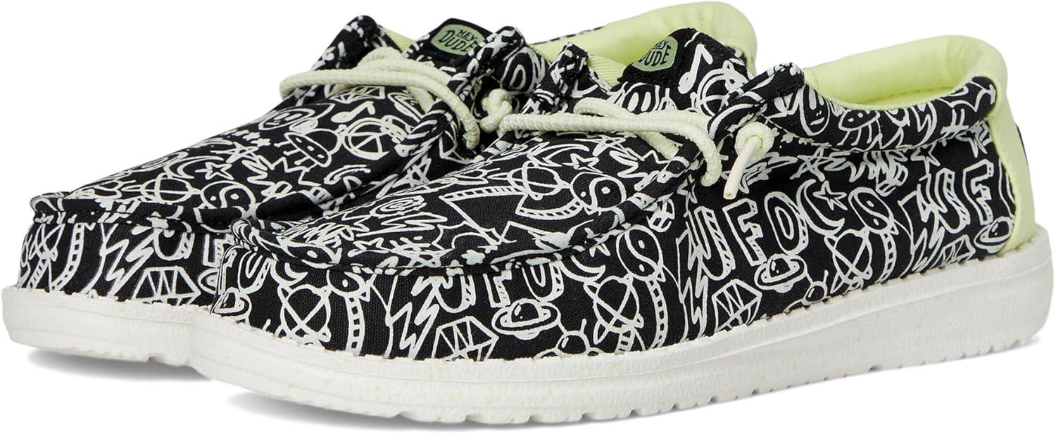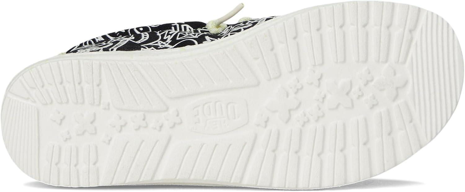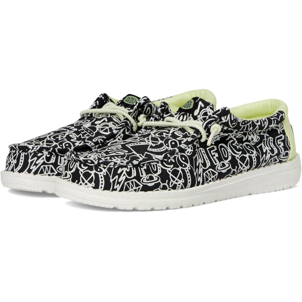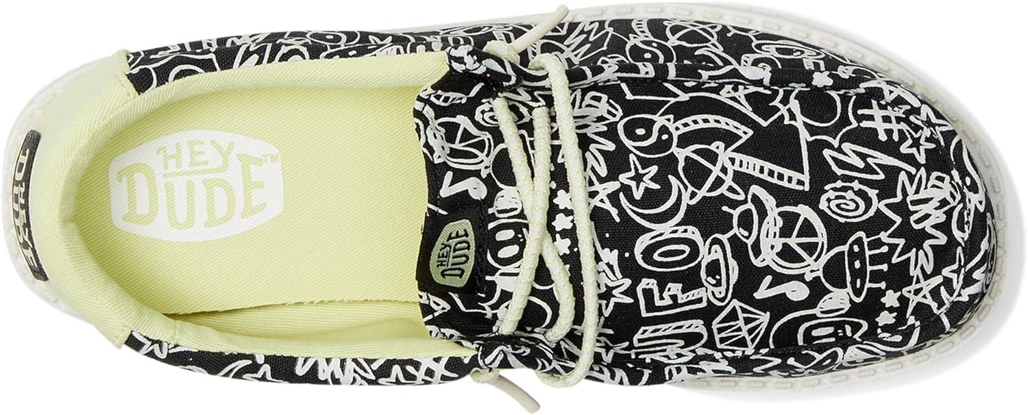 The Hey Dude Kids Wally Space Glow shoe is built for adventure with a breathable textile-canvas upper that keeps things light and breezy. Easy-on elastic laces make slipping in and heading out a breeze, while the cushy ethylene vinyl acetate outsole and removable insole deliver all-day comfort for nonstop play. Cotton lining. Low-top profile. Rounded Toe Design and Flex & Fold: This supports healthy feet with its unique shape giving complete freedom of movement.