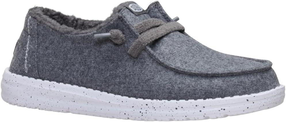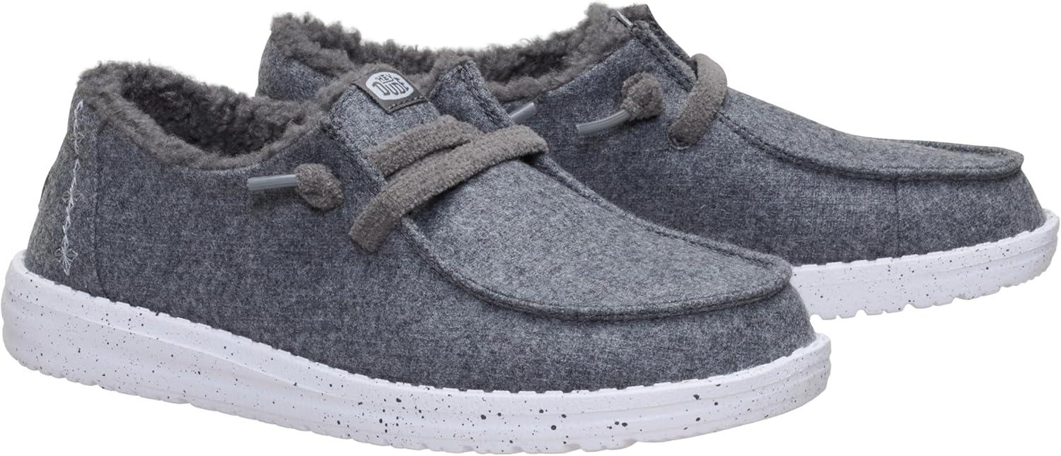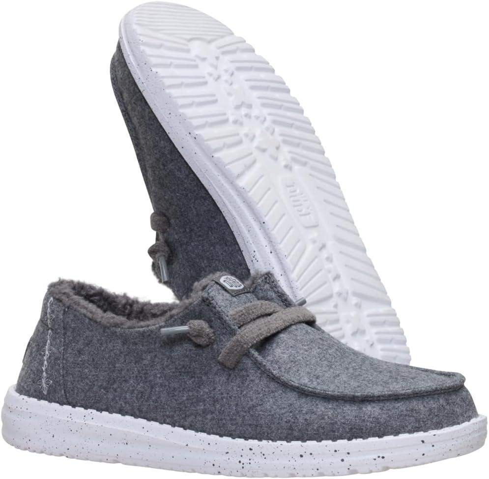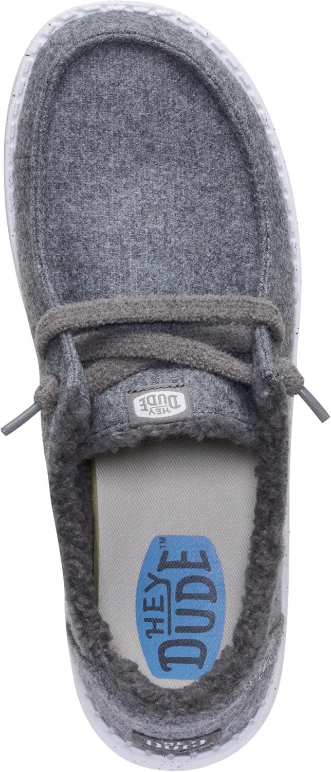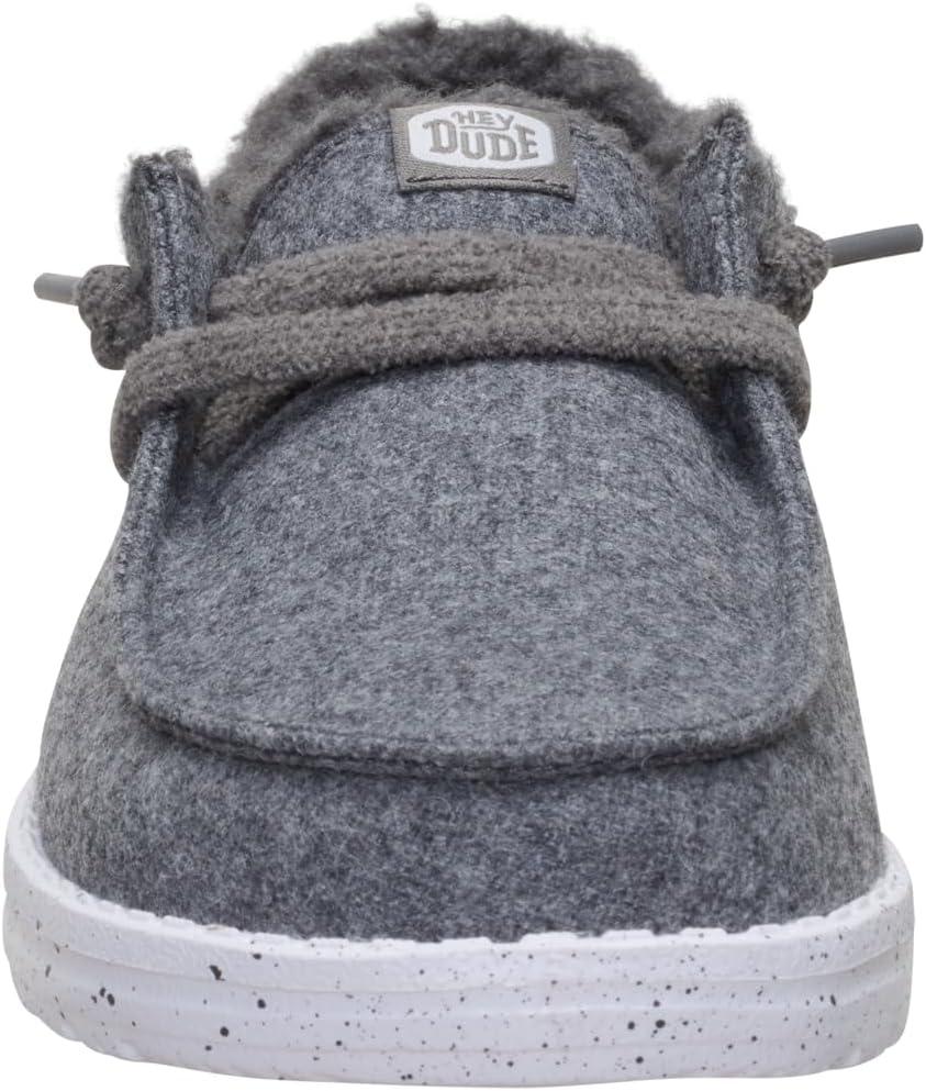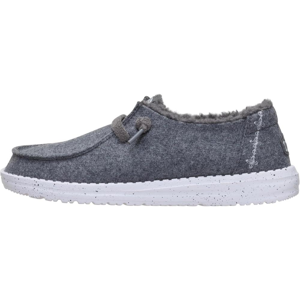 The Hey Dude Wendy Wool Cozy shoes are slip-on sneakers that are ready to roam. Their easy-on elastic laces offer a secure fit, while the polyester upper features a Flex & Fold design that supports healthy feet with their unique shape, giving complete freedom of movement. They are made of an EVA insole and a polyester lining. Round toe shape. EVA outsole.